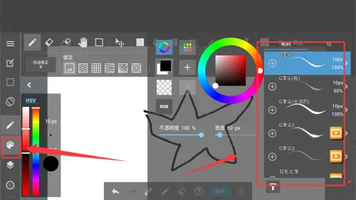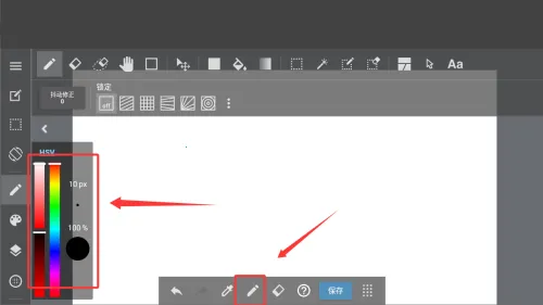 3、点击左边的红色箭头的画板然后点击右边的笔尖。