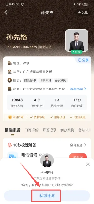 3、在律师详情页点击私聊按钮,即可开始一对一咨询对话。
